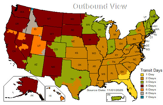 | Mapa muestra tiempo estimado de días laborables (con excepción de Sábados, Domingos y feriados) en el que su orden llegará si usted escoje el método de envío de UPS Ground. Los días laborables si su orden fue completada antes de 12:00 PM tiempo del Este comienzan a contar al siguiente día de su orden, si su orden fue realizada después de las 12:00PM hora del Este, su primer día laborable sera 2 días después. Ordenes realizadas días Viernes despues de las 12:00PM hora del Este serán procesadas el día Lunes y el primer día laborable sera el día Martes. |